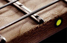 The fret markers are two-tone: outside there is a black circle for visibility under bright conditions. Inside I have included phosphorescent minerals to let the dots glow on a dark stage. | ||
