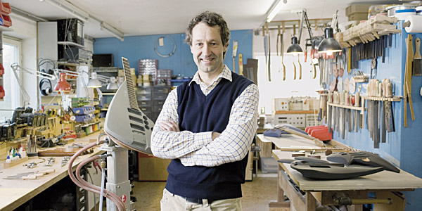 | 1965 | My great-grandfather was engineer, my grandfather was an engineer, my father is an engineer, my second grandfather was a cabinetmaker, my uncle is a cabinetmaker, my granduncle was a painter, so what can I say: becoming an accountant has never been my ambition. An inventor is a bit more my style. After my highschool degree I began an extended apprenticeship in metalwork and construction at Mercedes-Benz. During that period I learned that you can't name something "exact" if it isn’t down to one tenth of a millimeter. Today I think that the figure is actually beyond one hundredth of a millimeter. But everyone starts out as a beginner. A few years ago I had already built my first acoustic guitar (not the desktop-wood guitar which I made as a teenager) when I saw a book by Donald Brosnac which not only explained how to build an acoustic guitar but also showed gorgeous pictures of Steve Klein's instruments. I started at once on building a Steve Klein Acoustic. The guitar looked more like a Canadian hunting lodge with carvings and a soundhole on it. So I skipped that sample, and the first real guitar I built was a hommage to Steve Klein. At least I tried to replicate the form because I had no idea of his construction plans, which the pictures didn't show. In the following years and especially after I had founded my company on June 1st 1988, I spent my time building electric guitars and basses. In those years I designed my first guitar series "Dr. Mabuse" and the bass line "JFK" which was based on traditional example: glued-in necks, Mahogany, flamed maple, quilted, brazilian rosewood, pickups, tuners, vibrato from wholesale suppliers, glossy finish - the usual things. If you asked me about my most formative experience in guitar making, I’d have to say it was my study of industrial design from 1992 until 1996. In the year before I started I was dissatisfied with my guitar work. The series had been developed completely, the results were good instruments, and today they are even collectable guitars. But I had been looking for a wider challenge which I couldn't find in the realm of traditional guitar building. From the distance of my design study I learned to look at my guitar work from the distance. At the end I resumed work structuring it with themes and concepts and came back with the birdfish guitar. Two years later I created the coco series, then the tesla series and late 2007 the niwa. |